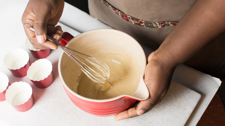 Goldman notes that if you are using a smaller pan than the recipe calls for, you can probably bake your cake at a slightly hotter temperature for a slightly shorter amount of time than the recipe states, though you don't have to change the oven temperature if that feels too risky. For example, if you are using extra cake batter from a 9-inch round cake recipe to make cupcakes, you may only need to bake the cupcakes for 18-23 minutes at 350, whereas that 9-inch cake may have taken 30-35 minutes at the same temperature. Making that small change to the baking time will ensure your cake stays moist throughout its whole bake.