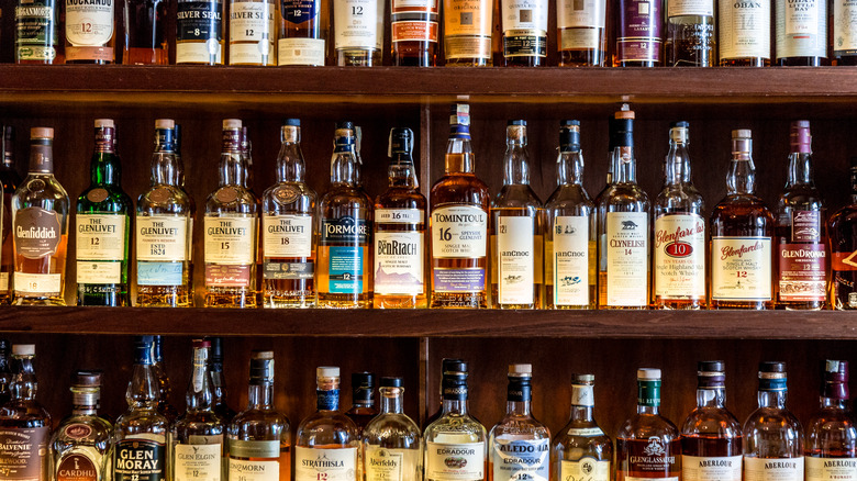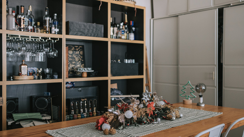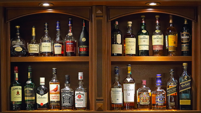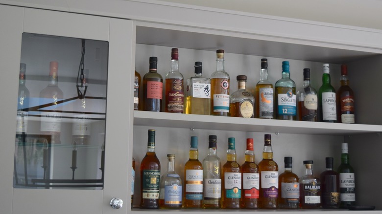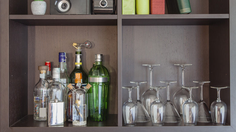 Now, you can get some beautiful bar carts, such as this rustic rolling cart from Ohsuaniy (available on Amazon). But a liquor cabinet generally gives you a cleaner and more organized look. Finding a liquor cabinet that seamlessly blends into the decor rather than looking out of place is fairly straightforward, too. If you're adding a liquor cabinet to a room with wooden furniture, for example, it'll likely be quite simple to find an aesthetic match. You can even convert a part of a kitchen pantry or sideboard into a liquor cabinet if you so choose.