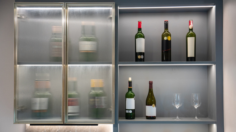 Now, that may be out of reach for most people, but a more simple and affordable solution is utilizing either shelving units or a bookshelf conversion. Shelving can give you a visually striking wall of spirits that not only looks fantastic but makes your bottles highly accessible, too. Repurposing a bookshelf is another way to make the most of a lack of space. Wine racks — like this elegant solution from Sonyabecca – are a common way to store bottles. They come in all different shapes and sizes, so you're sure to find something that fits your space.