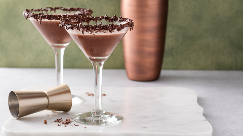 Chocolate blitzen usually incorporates chocolate ice cream, chocolate liqueur, Baileys, and vodka. You blend those ingredients together to make a smooth, velvety, and thick chocolate drink that's typically served in a martini glass. But it's not a chocolate blitzen without melting some chocolate to add to the rim of your glass. You can stop there if you want, but the chocolate rim is the perfect glue for more garnish. Throw on some chocolate sprinkles to the rim and make your chocolate blitzen extra festive.