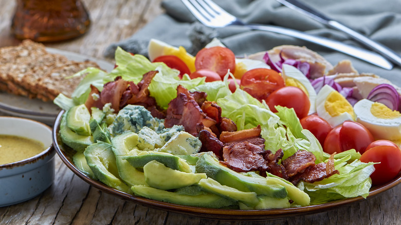 If there is one salad that is throwing a lot at you, it's a Cobb salad. It combines two different meats, chicken and bacon, with blue cheese crumbles, avocado, and hard boiled eggs at the minimum, and usually throwing in onion and tomato for good measure. That's not just one meal in salad, it's a whole buffet, and that means you need something strong to stand up to it. Cusack recommends a New England Style IPA (NEIPA) to go with this robust salad. He zeroed in on the standout flavors saying NEIPAs "will still stand up to the bacon and blue cheese in a Cobb–and provide a delicious contrast."