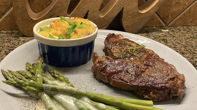 Using a ramekin to hold your mash also allows you to add some interesting cheesy gratin additions on top of your potatoes — in the broiler or with a kitchen torch. If you're a fan of compound butter to dress your steak, try adding a dab to your ramekin of mash as well; it looks and tastes great.
