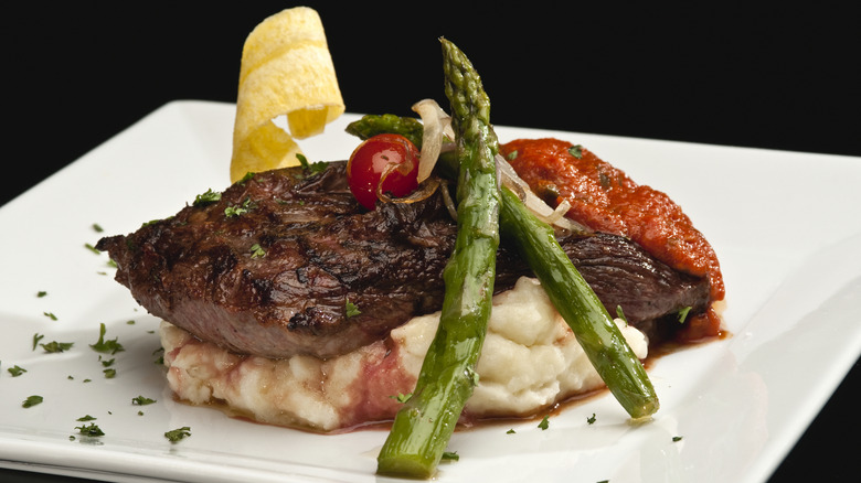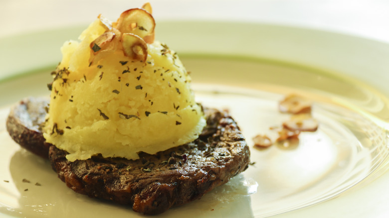 There is no cut of steak that can't be served atop a small mountain of mash — from a petit cut filet mignon to a king-sized prime rib. The potato puree doesn't have to be in a tall pile, either. You can create a plate-covering spread of potatoes with a little swirl for flair if you don't want to take the chance of your meat toppling off its perch.