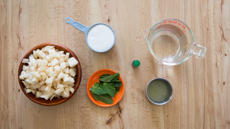 For this recipe, you will need four ripe red d'Anjou pears, but other sweet varieties of pears could be substituted if needed. Once the pears are peeled and diced, the quantity should be about 4 cups. Plan ahead because pears can take some time to ripen. You'll also need water, granulated sugar, fresh mint leaves, and lime juice. Finally, the recipe calls for green food coloring to color the sorbet like the movie version, but it will taste the same if you decide to leave that out.