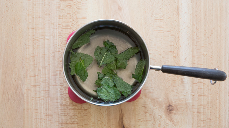 - Remove the pan from the heat, tear the mint leaves in half, and add them to the liquid. Let sit for 20 minutes to infuse before removing the mint. Set aside to cool completely, about 30 minutes.