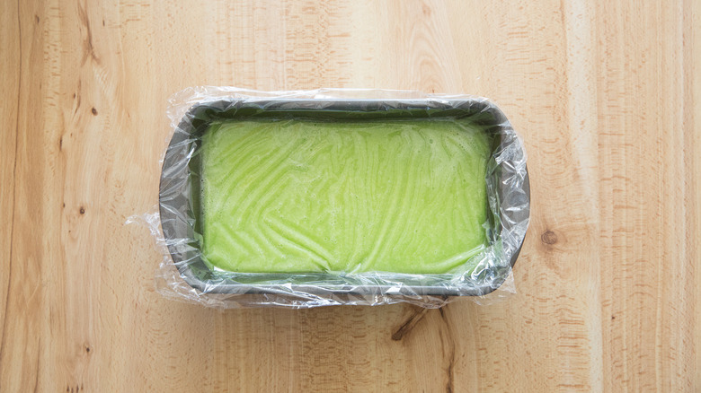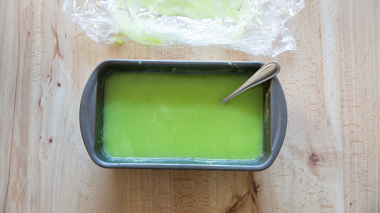 - Transfer the pear mixture to a metal loaf pan and cover tightly with plastic wrap, pressing the plastic to the surface of the mixture. Let chill in the refrigerator for about 2 hours until very cold.