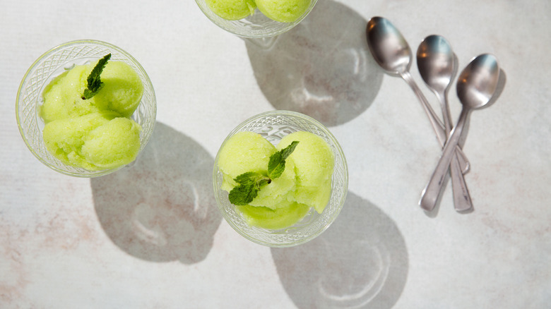 - Scoop the sorbet into individual dishes and garnish with mint leaves. Serve immediately.