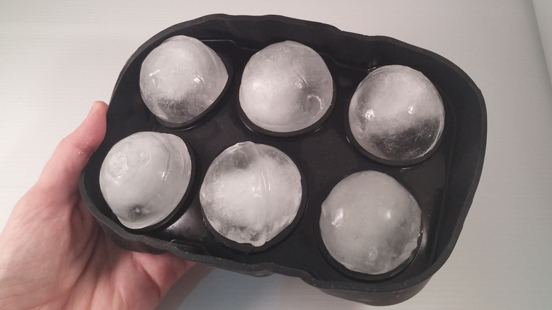 To make ice spheres, you'll need to invest in the right tools, which can include an ice sphere mold, a spherical ice cube tray, or even a sphere ice press. This 6-sphere ice mold on Amazon is a good option, but there are larger molds out there too. To really elevate your cocktail game, you may even want to make perfectly clear ice spheres using distilled water that's been twice boiled. If you're planning on serving strong drinks regularly, or having guests over, you'll want to make some ice spheres in advance — just be sure to store your cocktail ice properly, in plastic zipper bags.