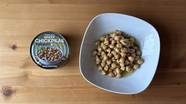 These beans are doused in a hearty dose of olive oil, in addition to parsley and, of course, cumin. That cumin flavor is quite intense, so if you love cumin, you're in luck. On the flip side, if you're not a fan of cumin, then you may want to leave these alone. There's also a lovely acidic note in this product that comes from lemon juice, which really brightens up the whole dish. You could use these chickpeas as a base for a salad, and you won't even need to add any additional dressing. They would also make for a delicious side dish or even main course on a hot summer's night when you just don't feel like turning on the stove. This Trader Joe's product shows what beans are capable of and proves that plant-based protein can be even more delicious than any hunk of meat.
