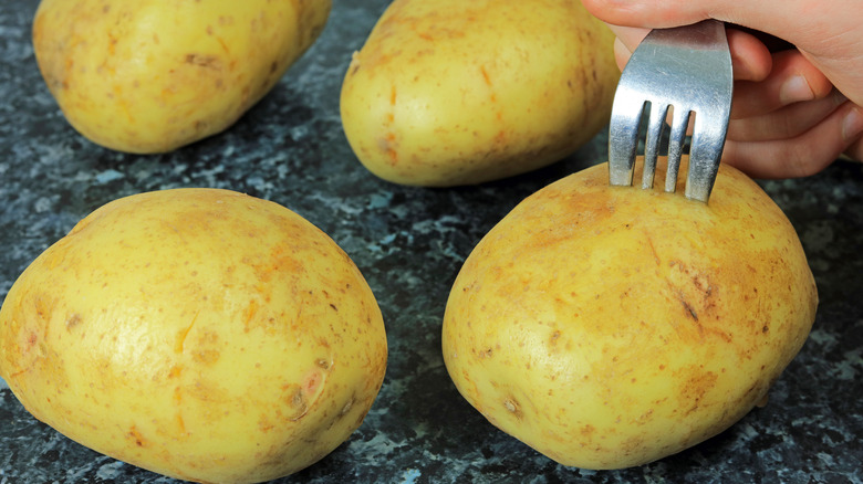 The answer is not as clear cut as we would like it to be, but if you're cooking a whole potato in the microwave, the answer is a resounding, yes – always prick it first. You can do so using the tines of a fork, pricking the entire surface area of the potato. If you don't make holes in the potato, it can explode in the microwave. As the potato heats up in the appliance, the heated water in the tuber becomes steam that the potato skin traps within. Without the holes, the steam does not escape from the potato. Instead, it can build, and pent up may ultimately cause the potato to explode.
