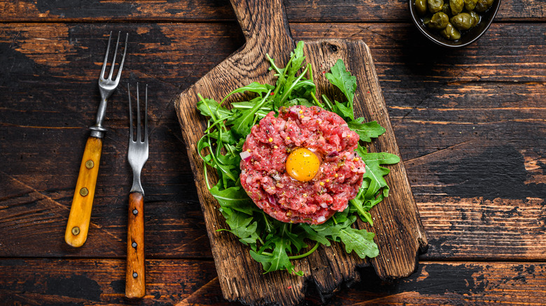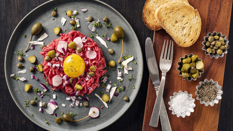 Steak tartare is perhaps an acquired taste, but those who do acquire it experience a luxurious dish. Once a snack of warriors, steak tartare boasts a centuries-long history, with its name likely originating from the French word "tartare" for the Tatar people of Central Asia. Over time, tartare came to mean preparing chopped raw meat. Today, it is a staple for fine restaurants and dinner parties. The dish is juicy, rich, tender, and savory, but should also feature a supporting cast of herbaceousness, saltiness, and spice. It's relatively easy to make steak tartare at home, especially with prep tips from a chef. You just have to know a few things about how to season it. To that end, we sought expert advice from chef K.C. Gulbro, owner of FoxFire in Geneva, Illinois, and Chef Ambassador for Certified Angus Beef.