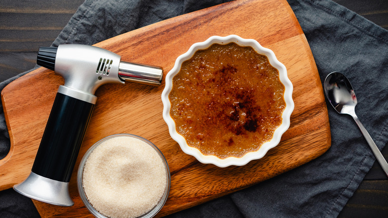Substitutions or alternative methods are common in recipes. Clever cooks can adjust to make up for a missing ingredient or a kitchen tool you may not have on hand. In some instances, a substitution might be available but they don't always produce the same level of results. That's the case with crème brûlée. You need to use a specific sugar and a specific method for burning the sugar on top — a torch. Most recipes will recommend a torch and instruct torchless cooks to place their custard under the broiler to achieve a similar result, but you should think twice before broiling crème brûlée. Your broiler will likely melt the sugar and brown it, but it won't give you the trademark burnt sugar crunch you're looking for.