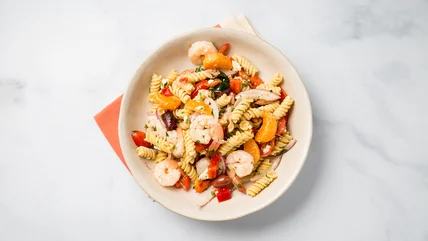 Recipe developer Michelle Bottalico has created a Greek shrimp pasta salad recipe that's colorful, aromatic, and packed with flavor. Fusilli pasta comes together with cooked shrimp, various vegetables, rich kalamata olives, and tangy feta cheese. Fresh parsley and basil add herby brightness, and mandarin orange segments add a playful citrus touch. Finally, a Greek vinaigrette that includes honey, lemon, Dijon mustard, and dried oregano brings the whole salad together.