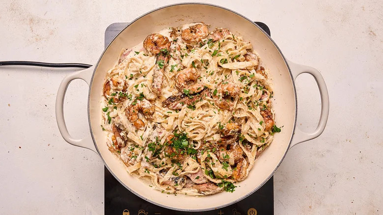 Even faster to prepare is recipe developer Michelle Bottalico's shrimp scampi. Not only is this mouthwatering meal ready in 20 minutes (if you boil the pasta while making the sauce), but it also delivers restaurant-quality flavor. The shrimp is quickly sauteed in the ever-satisfying, savory combination of butter, onion, garlic, and red pepper flakes until tender and juicy, and then set aside while the rest of the sauce comes together. More butter, white wine, lemon juice, and some starchy pasta water is added to the pan, creating a flavorful sauce for the asparagus to cook in, until fork tender. The shrimp is added back into the sauce along with the al dente pasta (you can use angel hair, spaghetti, or even fettuccini), halved cherry tomatoes, and freshly chopped parsley, resulting in a succulent dish that is packed with wonderfully rich, yet fresh flavors.
