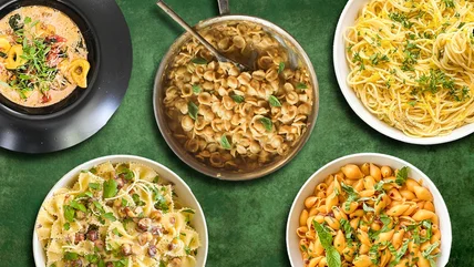 For this 30-minute, seasonal, summery pasta dish, recipe developer and professional cook Taylor Murray transforms plain sweet corn on the cob into something rich and creamy that is sure to be a hit with the whole family. The shape of orecchiette pasta is perfect for its ability to hold onto a corn kernel, though other shapes, like penne or conchiglie, will work equally well. You'll also need a few ears of fresh corn on the cob (although frozen will do if fresh corn is out of season), olive oil, yellow onion, white wine, heavy cream, and Parmesan cheese. The secret ingredient is a touch of mustard powder, which adds a bit of sharpness and tang to the creamy sauce. And don't forget to garnish with a few leaves of fresh and fragrant basil.