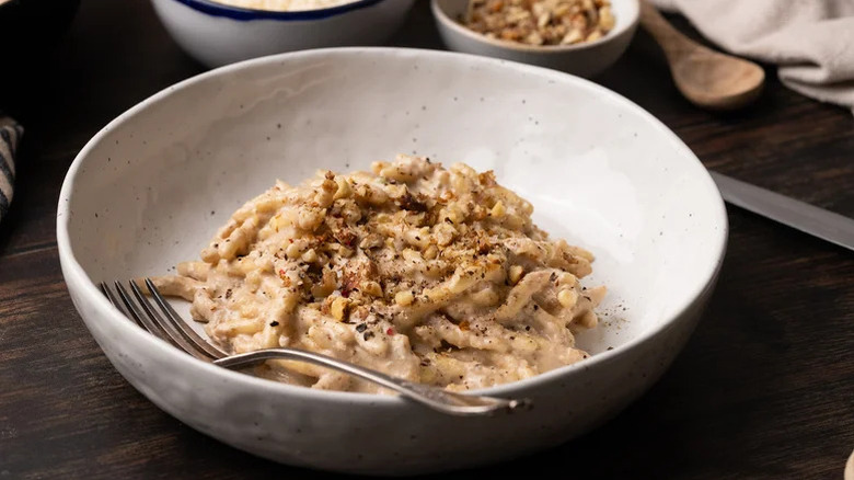 For our last pasta dish, may we suggest this lesser known, yet nonetheless comforting pasta dish recipe by Jennifer Rye, which beautifully highlights the flavors of the Italian region of Liguria. This dish features trofie pasta (but trenette, which is similar to linguine and fettuccine, works equally well), coated in a creamy walnut sauce that's both nutty and savory, with a touch of sweetness. The sauce is made by blending oven-toasted walnuts with milk-soaked bread, olive oil, garlic, and heavy cream, resulting a velvety texture that perfectly clings to the pasta. Seasoned with grated Parmesan cheese, this dish is simple yet decadent, capturing the essence of Ligurian cuisine's love for fresh, local ingredients. It's an excellent choice for a quick, casual dinner or a special occasion, offering a taste of Italy's beautiful coastal region in 30 minutes, pronto!