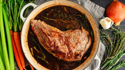 The Santa Maria tri-tip is a classic grilled steak with a dry rub flavoring, but if you prefer something a little saucier, K.C. Gulbro also gave us his method for a tender, slow-roasted tri-tip. "You can use the same marinating techniques overnight, sear the outside, and then place it in a roasting pan with a liquid like red wine, dark beer, or beef broth," he said. For a roast like this, the pan sauce that cooks with the beef can be an important part of the dish. "Adding some garlic, rosemary, and thyme enhances the flavor. If you like, you can include potatoes, carrots, and pearl onions in the roasting pan as well," the chef noted.