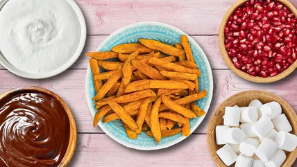 The natural sweetness of these fries comes from the fact that they are both in name and taste sweet potatoes. You can choose to use either the standard orange sweet potatoes or dress up your dessert even more with roasted purple sweet potato fries, provided you extend the roasting time longer to accommodate their increased density. From there, it's up to you to choose a variety of delicious toppings, ranging from nutritious to decadent, to make this the ultimate shareable dessert.
