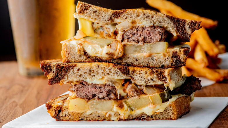 In my book, few things beat a classic patty melt. A first cousin to the hamburger, this marvelous creation pairs that ground beef patty with gooey melted cheese, grilled or caramelized onions, and dill pickle slices, all encased in slices of perfectly toasted rye bread — bonus if it's a perfectly swirled marbled rye for extra visual appeal. A staple of roadside diners since the 1940s, when Los Angeles restaurateur Tiny Naylor apparently created it as a quick, convenient sandwich, the patty melt has withstood the test of time and is still being served at some popular fast-food outlets and local restaurants across the United States.