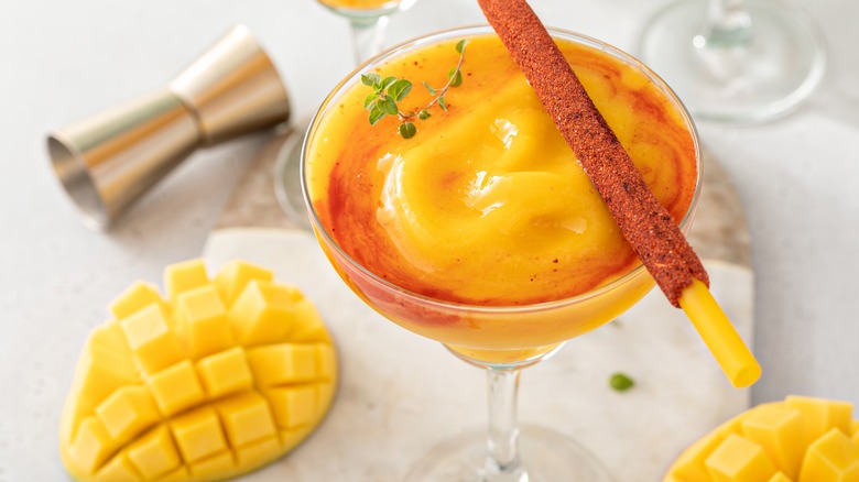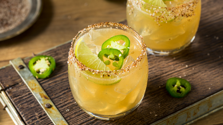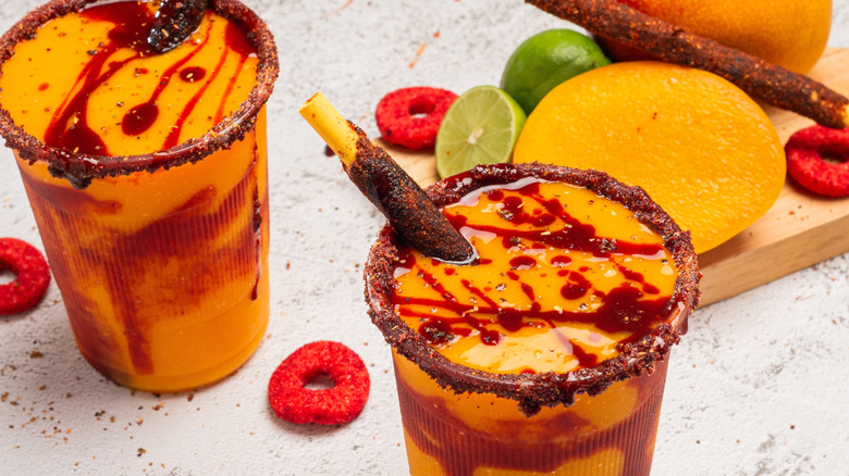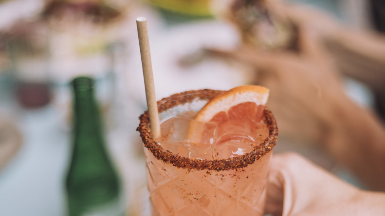 Oona Wong-Danders is the restaurant manager at the Four Seasons Hotel San Francisco, and she explained to us just why chamoy — and chili — works so well: "Its tangy flavor profile works well with the earthiness in tequila, and the spice from the chili contrasts well with the slight sweetness tequila gets from the agave plant." Best of all, it's super easy to do: Dip the rim of the glass in chamoy paste, then dip again in chili powder. Wong-Danders also suggests adding chamoy- and chili-coated cucumber or mango as a garnish as well, particularly if you're whipping up a fruity margarita.