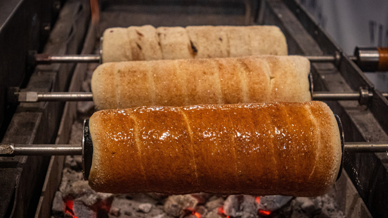 Chimney cakes are a Hungarian dessert with roots dating back to Medieval times. You can think of them like a less greasy, archaic version of funnel cakes. Like funnel cakes, chimney cakes are heavily associated with festivals and open-air markets where they're cooked on rotating spits over a live fire. Yeasted dough is rolled around a cylindrical spit, creating swirled dough with a chewy interior and golden, crispy outer texture.