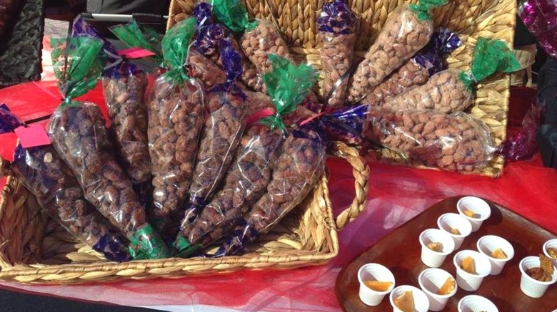 If you're on the hunt for a sugary, plant-based snack that you can pick at throughout the day, look no further than a sack of candied, roasted nuts — cheekily dubbed "The King's Nuts" at most faires. You'll find at least one small shack selling candied nuts at every large faire. They usually offer almonds, pecans, and cashews, all coated with a sweet, cinnamon-infused crunch, in small or large sizes. These snacks are among the more expensive at faire, but they're absolutely worth it.
