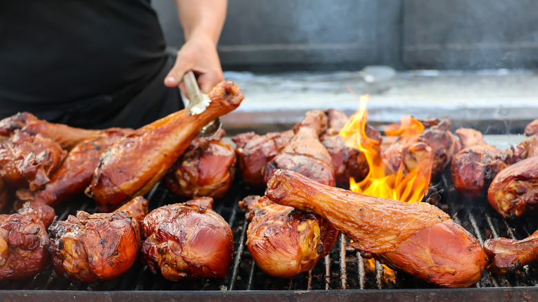 Turkey legs are undoubtedly the most famous Renaissance faire food (we won't talk about the fact that turkeys are native to America and definitely weren't a common food in 16th-century Europe). Despite being victim to rumors that the meat is made from pork, turkey legs are in fact made from turkey, although they taste very similar to pork. Turkey legs are soaked in a curing solution that gives them a briney, extra-juicy taste and texture. After they've been smoked, their wood-fired flavor also contributes to this pork-like taste, and it turns the meat pink.