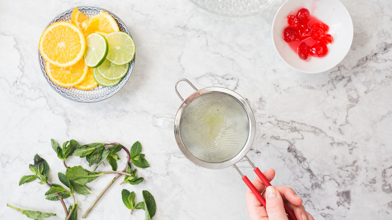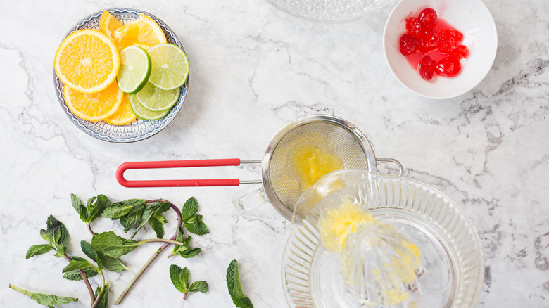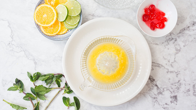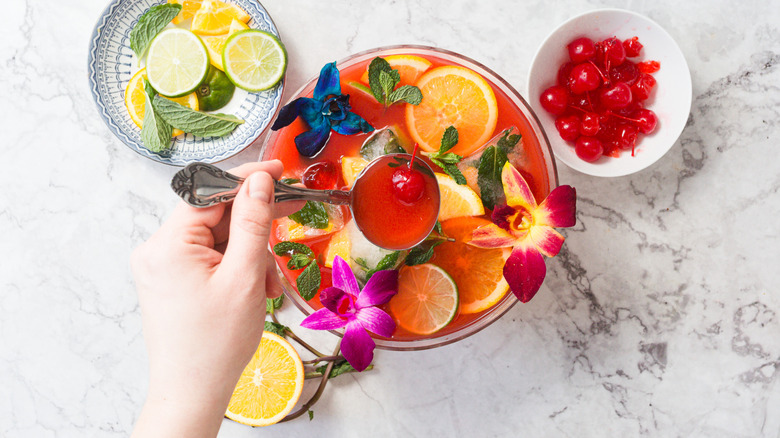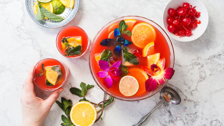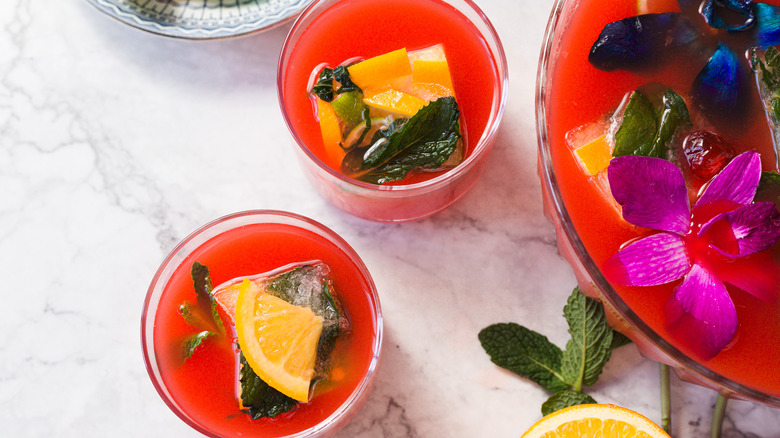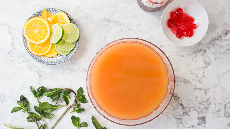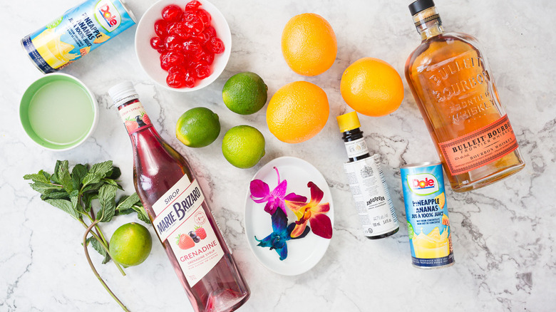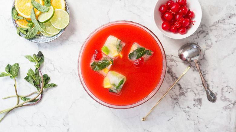 This iconic Gilmore Girls punch requires a few relatively simple ingredients, with the exception of one optional, harder-to-find component. For the ice cubes, you'll need oranges and limes, bright red maraschino cherries, fresh mint leaves, and water — and distilled water will yield the clearest ice cubes. For the punch itself, you'll want juicy oranges out of which we'll extract freshly squeezed orange juice, limes for lime juice, bourbon for that famous kick, sweet pineapple juice, ruby-red grenadine for color, and Angostura bitters for complexity and depth. And don't forget the garnishes that make this drink worthy of a Stars Hollow celebration: additional orange and lime slices for the rim, fresh mint sprigs for aroma and color, and if you can find them, edible flowers that add the perfect elegant finish to this potent concoction.