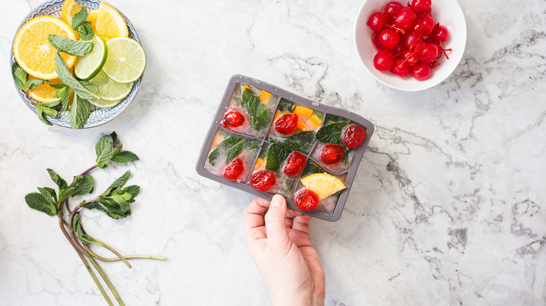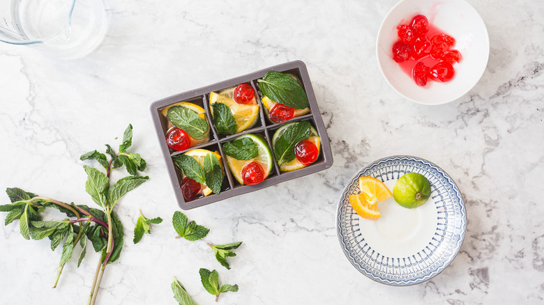 - Arrange orange and lime slices, cherries and mint in ice cube mold, and fill it with water.
