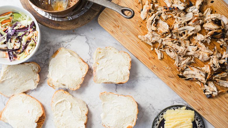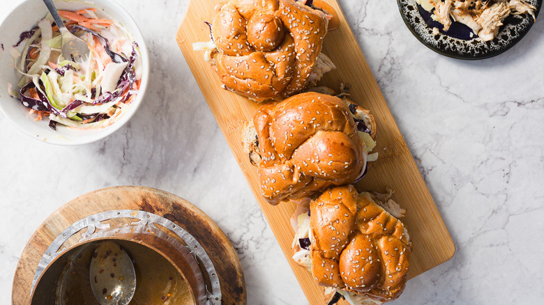 These party-perfect sliders need a seemingly lengthy list of ingredients in order to make their three distinct components. The bourbon marinade and glaze feature bourbon, maple syrup, brown sugar, soy sauce, apple cider vinegar, garlic powder, Dijon mustard, smoked paprika, salt, and pepper. For the chicken itself, we will be using skinless and boneless chicken breasts. For the refreshing coleslaw, gather green and purple cabbage, carrots, mayonnaise, apple cider vinegar, and honey. The spicy-sweet hot honey combines more honey with hot sauce and red pepper flakes. Finally, to assemble the sliders, grab a few mini challah buns or any other slider buns of your choice, additional mayonnaise, and aged cheddar cheese slices for a burst of tangy creaminess.