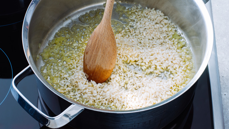 If you have opted to soak your rice, you will need to make sure that it's well drained before attempting this step. With the pan over medium heat, add your rice and toast for three to five minutes. You'll need to keep a close eye on it and stir as you go to avoid burning. You can do this in a dry pan for nutty notes or take a tip from Alton Brown and saute in butter or oil for added richness. Once your rice has reached the perfect toastiness, you can add your cooking liquid.