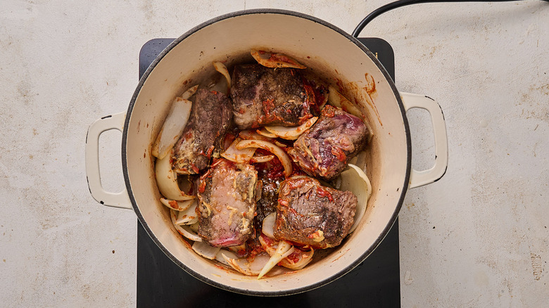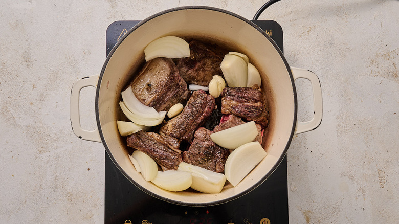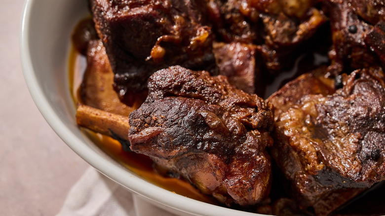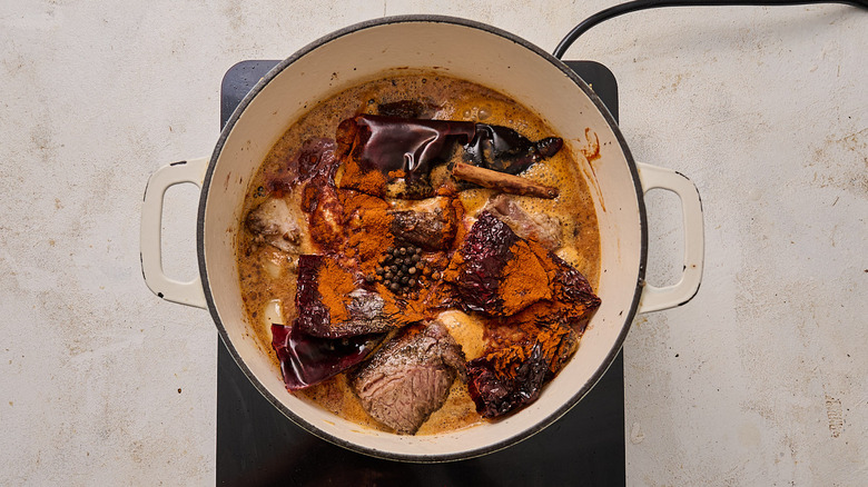 First, head to the butcher and find around 1 ½ to 2 pounds of thick, meaty short ribs. Meaty, according to Ina Garten, means about 1 ½ inches of meat on top of the bone, which ensures more meat and less fat in the final dish. From there, you'll just need salt, pepper, and oil to begin the searing process. For the braise itself, you'll want to grab a yellow onion, garlic, tomato paste, Dijon mustard, beef broth, peppercorns, paprika, a cinnamon stick, and a stout beer. When you think of stouts, you probably think of Guinness — no need to overcomplicate it, use Guinness or your favorite stout otherwise. The last thing you'll need are dried ancho and guajillo chiles, which you can find at most grocery stores or in Latin American markets.