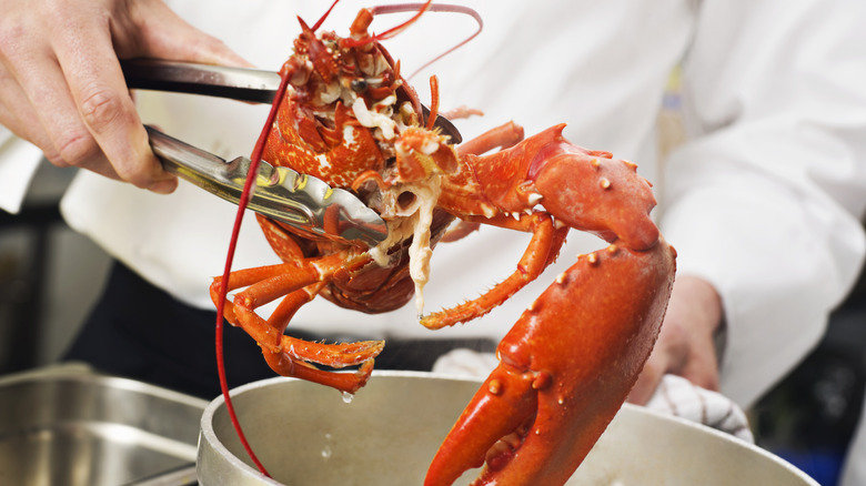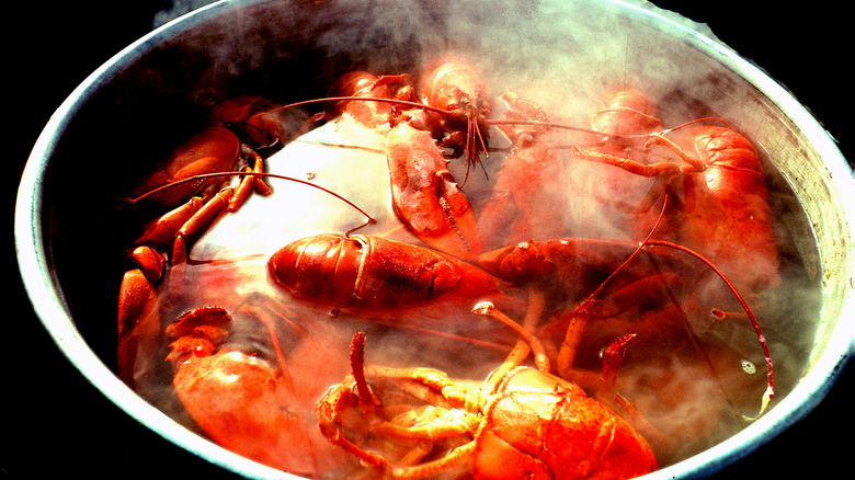 How you add the lobsters to the pot is also important. "Live lobsters should be added one at a time," Brown advises. "You should also periodically lift the lid (carefully) and shift the lobsters around, so they cook evenly." Use a large pair of tongs and oven mitts when doing this to avoid burning your hands and arms — steam burns can be quite nasty.