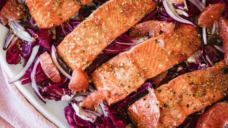 Some home cooks try to cut down on bitterness in their dishes as much as possible, but sometimes, you need to embrace the bitterness. That's exactly what you'll do when you make this "embrace the bitter" grapefruit salmon salad. It calls for radicchio, grapefruit, and red onion, which join forces to create a crunchy bed of salad for the broiled salmon. To make this more appropriate for a potluck, you can cut the salmon into small pieces instead of keeping it in whole filets. That way, it'll be easier for every guest to grab a little taste.