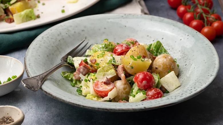 Whether you're going to a BBQ cookout or you just want to bring something cold and hearty to the party, this filling and refreshing BLT potato salad is sure to hit the spot. As the name suggests, it's made with bacon, lettuce, and tomato, which gives this salad just the right combo of fat and freshness. Combine that with some scallions, a creamy sauce, and, naturally, the potatoes, and you have an unconventional potato salad that's way better than anything you can buy at the grocery store.