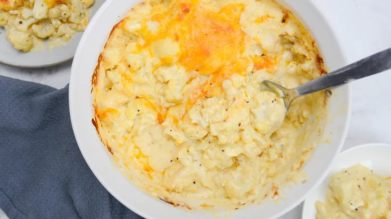 Whether there are going to be gluten-free guests at your potluck or you've just been asked to bring a veggie dish, you should consider making this roasted cauliflower "mac" and cheese. It doesn't actually contain any macaroni at all, instead opting for riced cauliflower in its place. Once it's absolutely drenched in cheese, you'll find that it's just as rich and decadent as any traditional mac and cheese you've ever had — and your guests aren't likely to disagree.