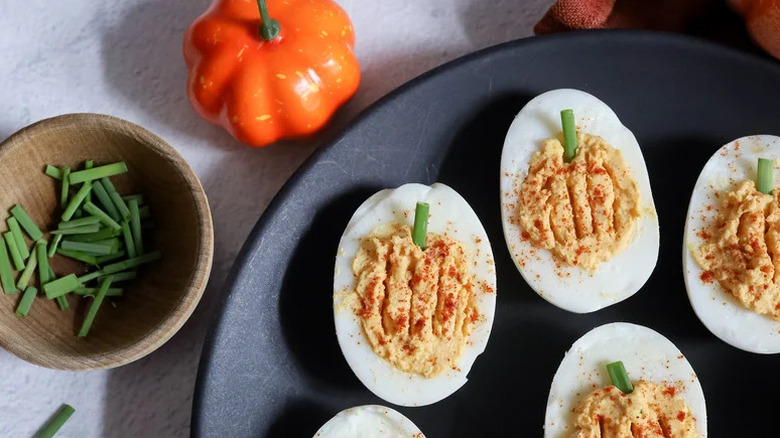Deviled eggs are a potluck classic, but you don't want to bring the same old boring version that everyone makes, do you? For something a bit out of the ordinary, try switching it up with this recipe for smoky pumpkin deviled eggs. It features pumpkin puree, which lends a creamy consistency to the filling along with an earthy flavor, as well as smoky, savory paprika, which prevents things from tasting too sweet. This is an especially fun dish during the autumnal months, but by using canned pumpkin puree, you can make it at any time of the year.