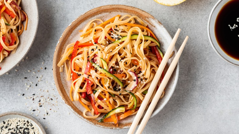 Knowing this, it makes sense why Derek Chan doesn't find it necessary to salt the water before adding the noodles into his recipes — because many of them already call for enough savory flavors. With common ingredients ranging from umami-bursting fish and soy sauce or gluten-free tamari (like this one by Roland Foods on Amazon), and sesame oil to chili garlic sauce, salting the water for your rice noodles could potentially send your dish into savory overload, overpowering all the other flavors that make it unique. Skipping the salt in the water, and adding in a combination of salty and umami ingredients — think fish and soy sauce — along with brighter, more sour flavors — be that chili paste or lime juice — you'll achieve a balance that's much more aligned.