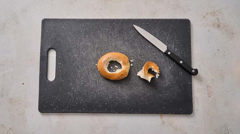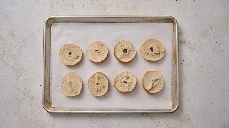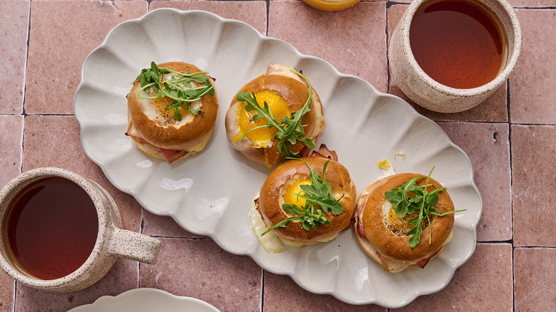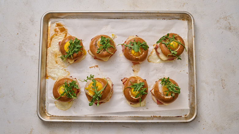 Adding the eggs to the sliders can be a little challenging. If you've ever made a "toad-in-the-hole" sandwich — the American kind, not the British one — which involves frying an egg into a sliced-out hole in a piece of toast, then this technique will be familiar to you. What makes it challenging in this recipe is the small size and the odd shape of the bagels. To avoid egg spilling all over the sheet tray (which may happen regardless, but don't worry), you'll want to crack your eggs ahead of time.