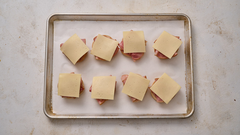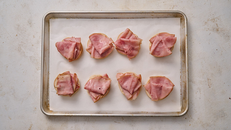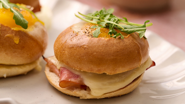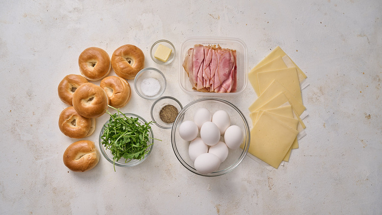 The first thing you'll want to grab, and what makes these sliders unique, are miniature bagels. They're easier to find than you'd think, as a few of the biggest bread brands have their own versions. Check the bread aisle for Pepperidge Farms and Thomas bagels, and if you can't find them there, try the recipe with one of the brands' regular-sized bagels instead. From there, head to the deli for sliced ham and sliced Gruyère — if you can't find Gruyère sliced, you can use provolone, Swiss, or Havarti. You can also shred your cheese, if Gruyère is a must-have. Then, just grab eggs, butter, salt, pepper, and arugula to finish building the sandwiches.
