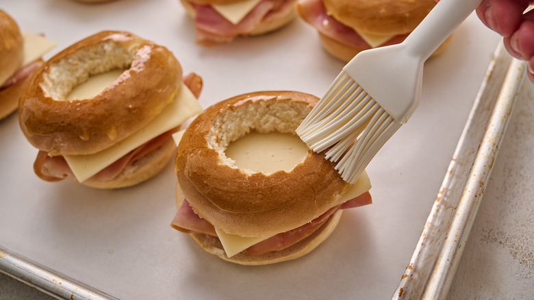 - Top with the top piece of bagel and brush the tops of the bagels with melted butter.