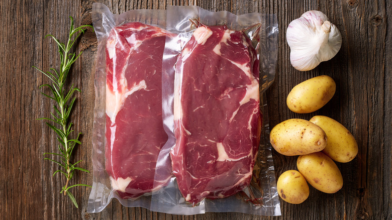 There is one step that Guard thinks is essential, telling us, "Always wrap them up. You don't want air getting to the meat because that's what leads to oxidation and freezer burn." And freezer burn isn't just about appearances or some extra moisture. Guard warned us, "if you just toss a steak in the freezer unwrapped, it's going to dry out and lose flavor fast." While there are a few ways that you can package your favorite cuts of steaks for freezing, he has a clear preference: "Vacuum sealing is the best way to go."