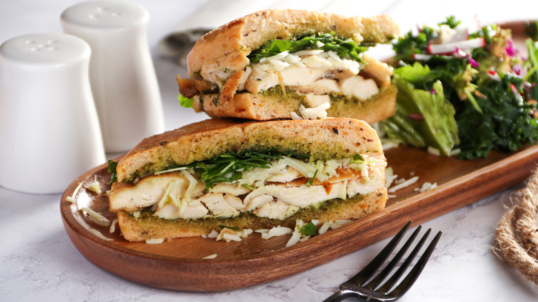 Once your chicken is prepared, the possibilities are wide and deep. A slice of nutty Swiss cheese and a schmear of garlicky pesto is simple and classic, but you can and should get more creative. Give your chicken a healthy dose of spice by making a copycat version of Nando's Peri Peri chicken sandwich. Lean into the mouth-watering combination of sweet and salty by making a chicken and pear panini brimming with white cheddar and fig jam. For a perfect example of turning a traditionally decadent sandwich into something both effortless and healthy, make a baked chicken katsu sandwich loaded with crunchy coleslaw and slathered in spicy Sriracha mayo. With so many delicious and simple ways to add more protein to your diet, you'll wonder why you hadn't thought to zhuzh up your chicken sandwiches sooner.
