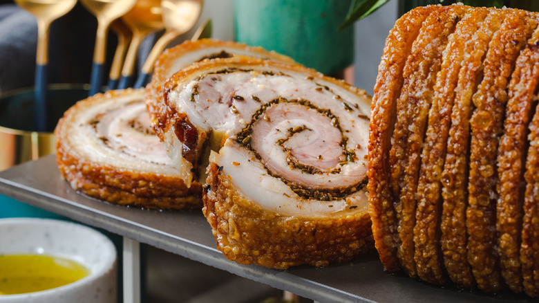 The process of making a porchetta might seem daunting, but it's really just like any other roast, requiring some patience and a good cut of meat. Because a porchetta is rolled into a tight cylinder before roasting, it's one of the most approachable roasts to carve — you'll get nice, even slices of meat that are beautiful on the serving plate. The slices make wonderfully rich sandwiches, too, especially when tempered with a handful of greens or sauteed peppers.