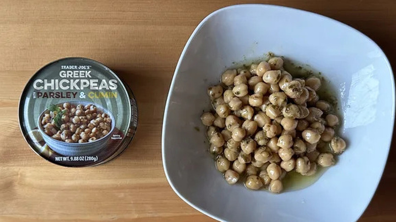 Trader Joe's Greek chickpeas check off all the boxes, starting with a plump and firm form that doesn't get mushy despite the canning process. Unlike many basic canned beans, the canning liquid is the component that imparts the complexity. Infused with tangy lemon juice, diced parsley, salt, and ultra savory cumin, the liquid acts as a delicious dressing that brings out the savory and subtle taste of the chickpeas. Plus you don't have to worry about draining and rinsing these legumes, or even heating them up for that matter. You can enjoy them straight out of the can for a flavorful snack, side dish, or protein-packed main course.