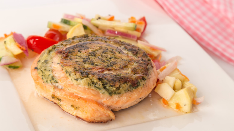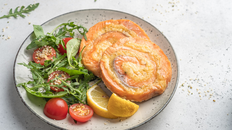 The higher fat content of salmon and the creamy feta cheese contribute moisture, but these salmon pinwheels aren't immune to drying out, especially if you're trying to get a crispy exterior. An air fryer, careful attention, and a resting period are key to finding that balance of crispy salmon skin with a tender and juicy interior. A crispy exterior requires a high temperature, while a juicy interior is easier to achieve with a shorter cooking time. Consequently, you should use an efficient air fryer, preheated to 400 degrees Fahrenheit, to quickly cook the pinwheels for eight to 10 minutes. Spray the pinwheels with PAM cooking spray or lightly brush them with olive oil before cooking them. The preheated, ultra-hot convection temperature combined with that thin layer of fat will ensure a crispy pinwheel.