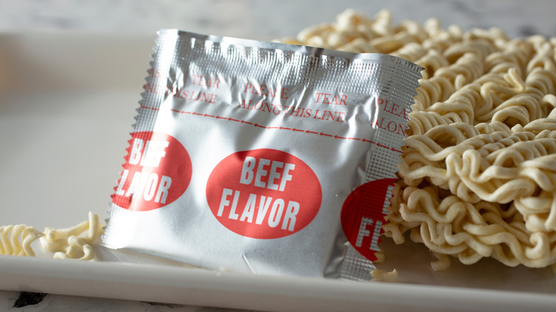 Packs of savory ramen noodles are a pantry staple for college students and celebrity chefs alike — and for good reason. They're inexpensive, consistently tasty, fast to cook, and insanely versatile. You can use the noodles in dozens of different ways, and those little flavor bomb seasoning packets can also be put to use creating flavorful food outside the noodle bowl, too. One easy way to bring the delectable flavor of ramen broth into your life is simply sprinkling a pack of seasoning into a bag of your favorite chips.