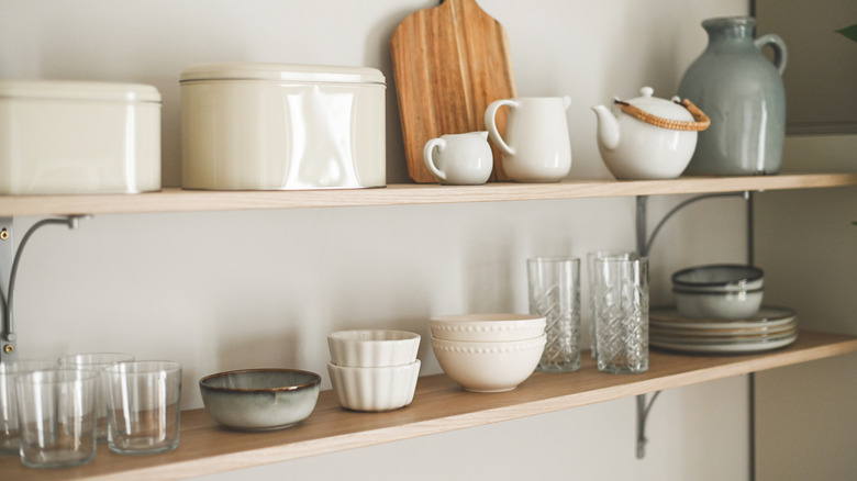 Apart from regular maintenance, open shelving also requires you to be organized at all times so the items you've displayed look appealing. This design choice might not be for you if your crockery is mismatched and cluttered, as an array of designs and colors can overwhelm a kitchen space. Having said that, some people like the pressure of having their plates on display as it forces them to streamline and embrace minimalism. It also means they have easy access to daily-use items, such as cereal bowls and dinner plates, making it a useful kitchen organization hack. Moreover, if you don't live on a busy street or keep their windows open, your shelves may not get dusty quickly.