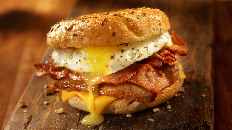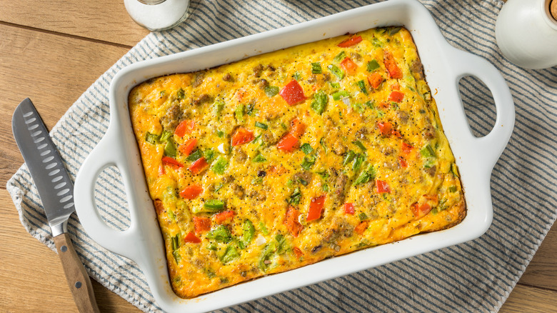 Feel free to keep your eggs simple, with a dash of milk and seasonings, or toss in extras, like baby spinach, chopped bell peppers, or sliced jalapeños to add more flavor. A sprinkling of cheese and herbs is also a breezy way to add extra protein to your eggs and boost their aromatic savoriness. However, be wary of stirring through too many add-ins, or they'll take longer to cook, and you'll land in crustless quiche territory. While a sheet pan quiche is a scrumptious way to use up a carton of eggs and veggies, it may be too hearty for a quick breakfast sandwich, particularly if you're topping your squares with meat.