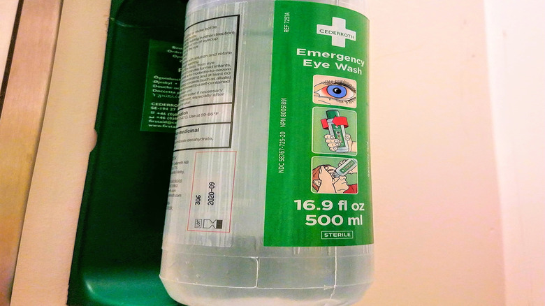 The first aid station in a commercial kitchen will almost always include an eyewash station, with either a special faucet to rinse your eyes or an eyewash bottle mounted to the wall and filled with a sterile cleaning solution. It's essential in the workplace, because splashing your eyes with cleaning chemicals or absent-mindedly rubbing them after cutting hot peppers can be pretty serious.